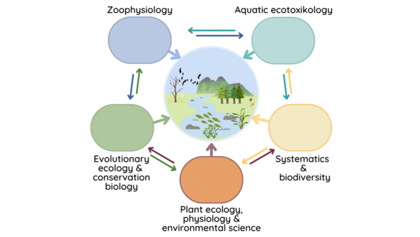 The question we deal with usually originate from classical biology subjects like physiology, cell biology, ecology, evolutionary biology and systematics but also include broader topics like conservation biology and environmental sciences. From that we have identified five main research areas, that covers most of the research done at the department. , Aquatic ecotoxicology, Evolutionary ecology & conservation biology, Systematics & biodiversity, Plant ecology, physiology & environmental science and Zoophysiology. But there are often no sharp boundaries, and to answer complex questions we collaborate both within and between the areas.
