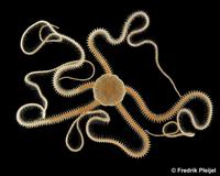 Amphiura filiformis is a burrowing brittle star with a disc up to 10 mm in diameter with long arms (10 x disc diameter in average) that extend into the water column for suspension feeding, making it an ecosystem engineer and important food item for flatfish, cod and crayfish. It is the dominant species on many sublittoral soft bottoms down to 200 m depth in the North Sea and the Mediterranean. Amphiura filiformis has exceptional adult regenerative abilities and can regenerate fully functional arms in a matter of weeks. A. filiformis has separate sexes and reproduce annually during the summer months (July-September). Adults are at least 3 years old before they are mature and have a life span of 10-20 years. Larvae is planktotrophic and metamorphose a month later under culture conditions. Both larvae and adults can be cultured in our facilities.