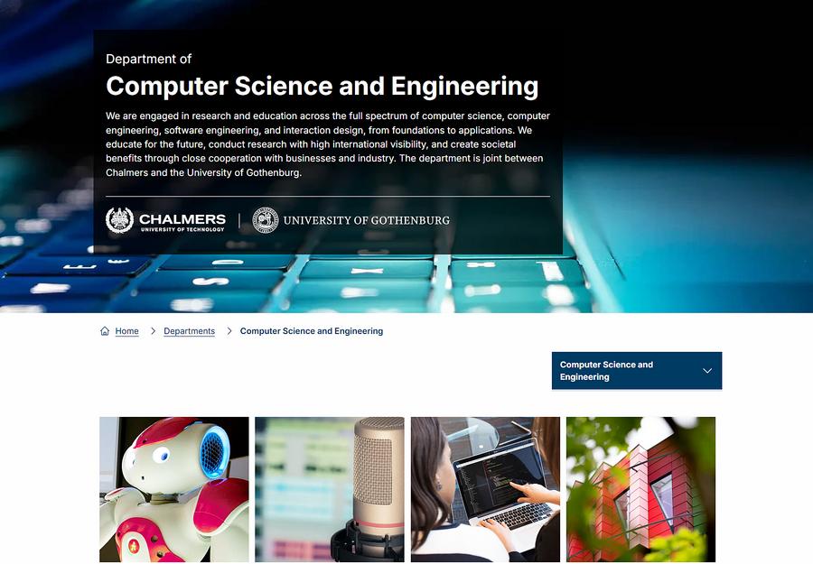 The Department of Computer Science and Engineering is joint between University of Gothenburg and Chalmers University of Technology. The department is organised into five divisions, with a number of research groups working in and in between them.