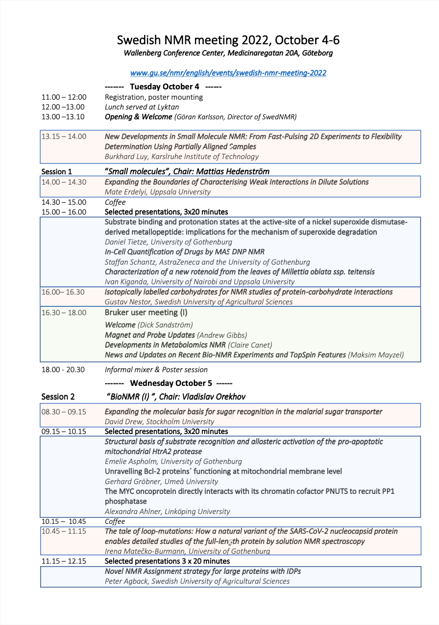 Scientific committee: SwedNMR module groups & Mattias Hedenström, Sergei Dvinskikh, Vladislav Orekhov, Göran Karlsson.