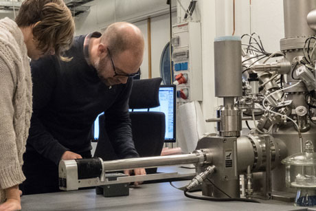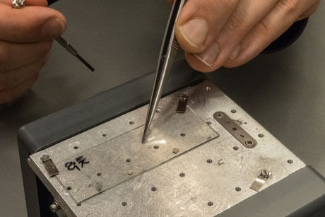 Chemists Lina Hagvall and Per Malmberg prepare samples for analysis in the time-of flight secondary ion mass spectrometer (ToF-SIMS). During analysis the samples are inserted into the test chamber using the test arm shown at the bottom of the picture. Text and photo: Mats Tiborn, Chalmers.