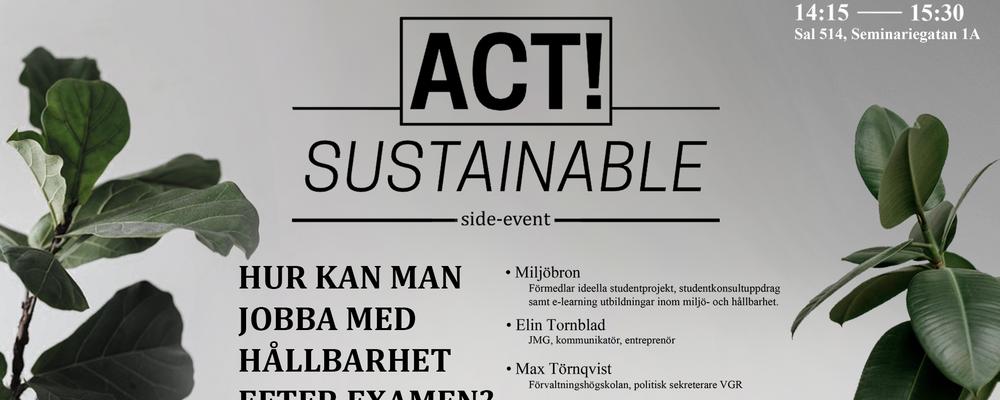 Sidoevent till ACT! Sustainable. Dagens tema är ”Hur kan man jobba med hållbarhet efter examen?”. Medverkande är Miljöbron, Elin Törnblad, Max Törnqvist och Ellen Thersthol.