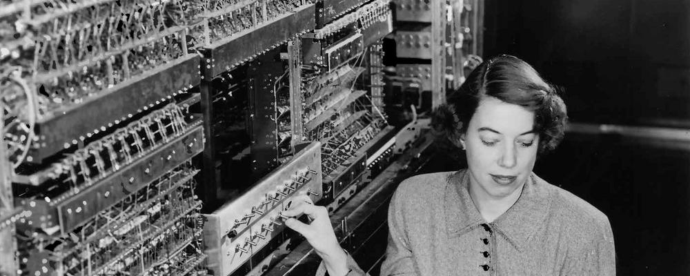 Fotografi av datavetaren Jean F. Hall vid Argonne National Laboratorys första digitala dator, AVIDAC. Wikimedia Commons.