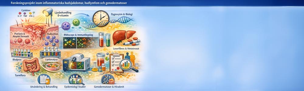 Forskningen omfattar kliniska och experimentella studier om inflammatoriska hudsjukdomar, främst psoriasis, atopisk dermatit och hudlymfom. Projekten undersöker D-vitaminnivåer, effekter av ljusbehandling samt analyserar lipider, D-vitamin och dess receptorer i hudvävnad med metoder som masspektrometrisk avbildning, RNAscope® och immunhistokemi. Studier belyser även hur dygnsrytmen påverkar hudens biologi och hur denna reglering förändras vid psoriasis. Andra projekt rör samband mellan hudsjukdomar, depression, tarmflora och livsstilsfaktorer. Forskningen omfattar också utveckling av utvärderingsverktyg, behandlingseffekter vid atopisk dermatit baserat på SwedAD-registret och risk för leverfibros vid metotrexatbehandling. Dessutom ingår epidemiologiska studier om hudlymfom, genodermatoser och hidradenitis suppurativa i Västra Götaland.