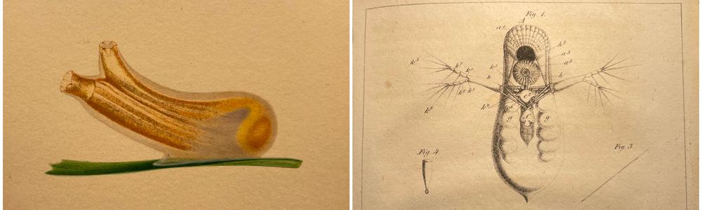 Illustration av tarmsjöpung (Ciona intestinalis) från Sven Lovéns personarkiv, Kungl. Vetenskapsakademien. Illustration av Evadne Nordmanni, Kungl. Vetenskapsakademiens handlingar 1835.