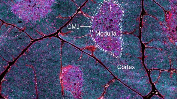 Mänsklig thymusvävnad färgad med 27 olika fluorescerande antikroppsmarkörer. Morfologiska regioner (olika områden i vävnaden med särskild struktur), såsom cortex, medulla och den kortikomedullära gränszonen (CMJ), är markerade.