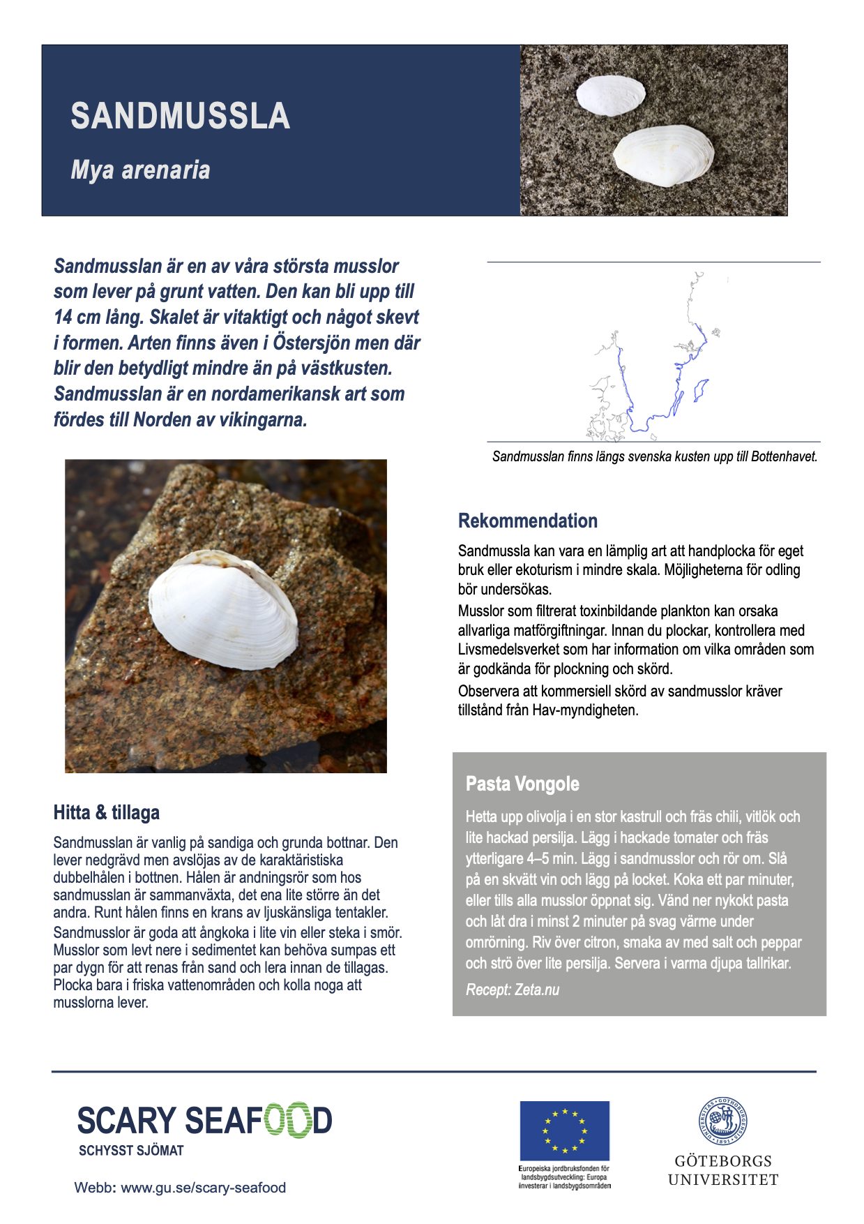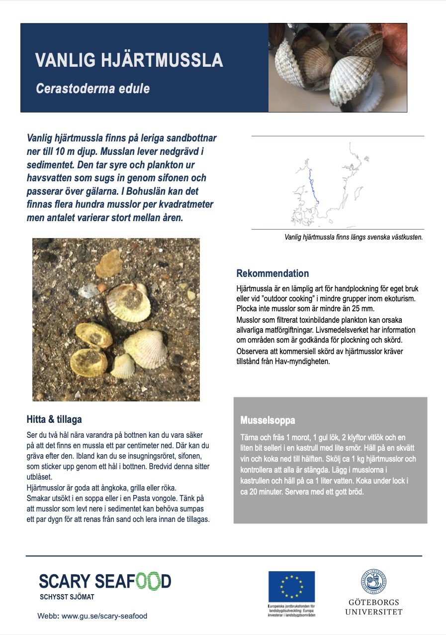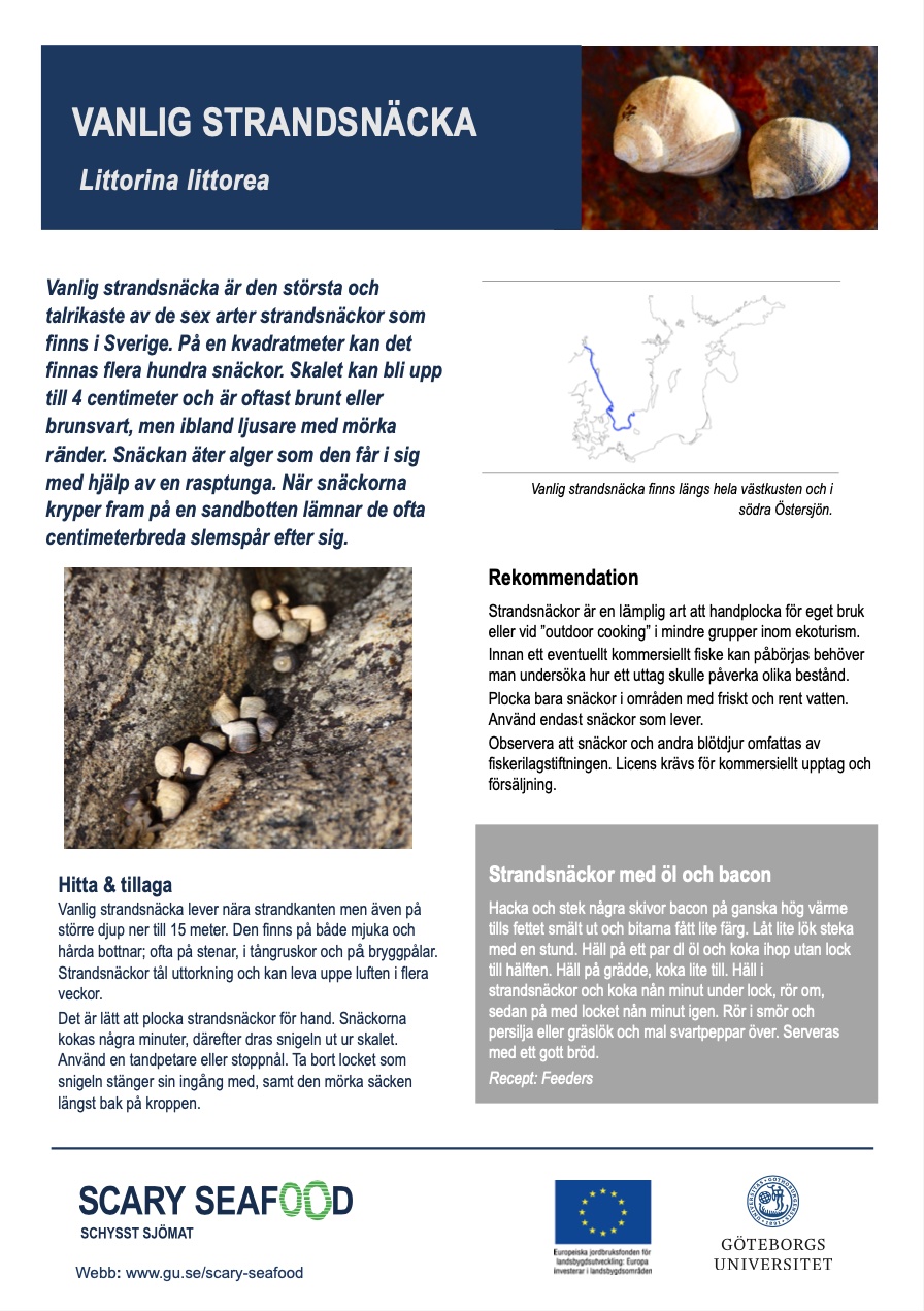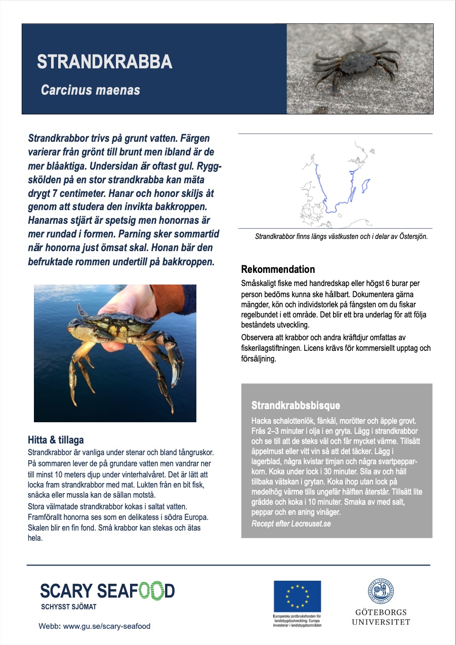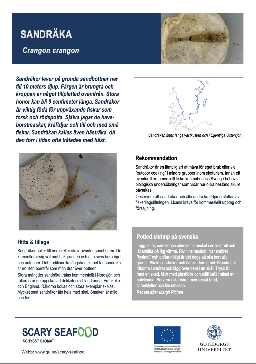 Här kan du ladda hem faktablad om några djurarter som kan vara lämpliga att använda som "scary seafood". Eftersom vi har väldigt lite kunskap om arternas biologiska status och hur mycket fiske de "tål", gäller våra rekommendationer enbart småskalig plockning för eget bruk och ekoturism i mindre skala.