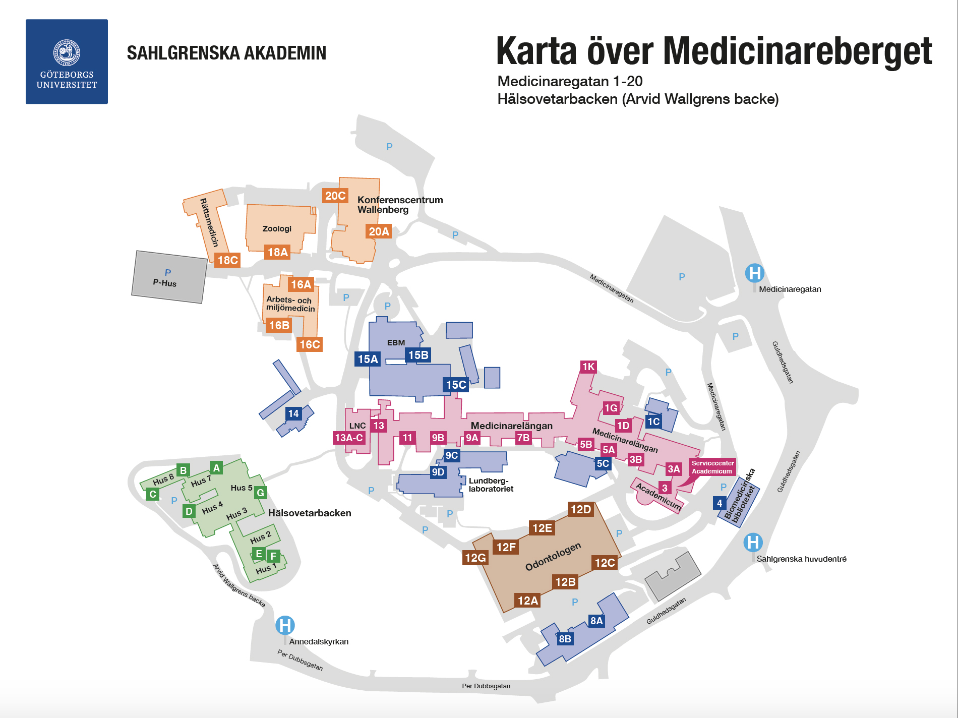 Vi finns på Hälsovetenskapligt centrum på Guldhedsgatan 5A (nära Wavrinskys plats) på plan 3 och 4.