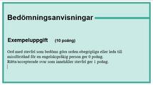 Observera att uppgifterna nedan inte är ett exempel på ett helt prov, utan visar på olika typer av uppgiftsformat som kan förekomma i proven. Här finns därför uppgifter som kan upplevas både lättare och svårare. Alla typer av uppgifter förekommer inte i varje prov och nya svarsformat kan komma att introduceras.