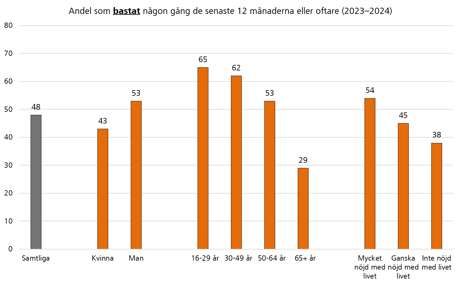 Svenskar som bastar regelbundet är i högre utsträckning nöjda med sina liv enligt SOM-undersökningen. Män och yngre bastar mer än kvinnor och äldre. Högst andel bastubadare återfinns i Norrbottens och Uppsala län.