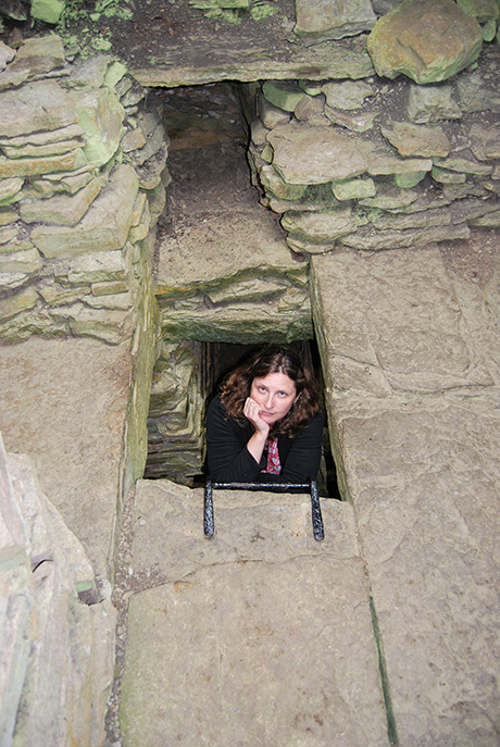 Bettina Schulz Paulsson i en megalitgrav på Rousay, Orkneyöarna, Skottland.