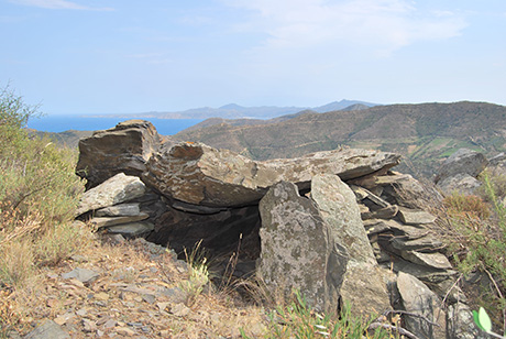 Megalitgraven Dolmen Coll de Pinyer, Pyreneerna, Frankrike och den spanska udden Cap de Creus.