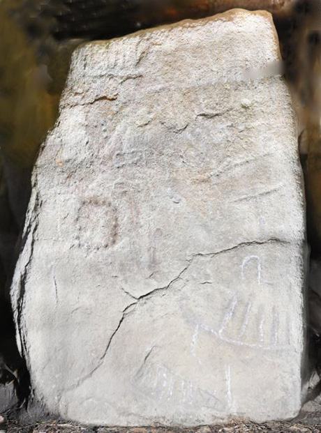 Sten med båtinristningar i megalitgraven Mane Lud, Bretagne.
