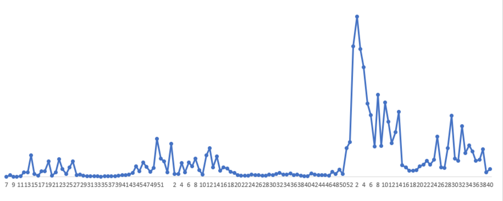 Utvecklingen av coronahalten i avloppsvattnet i Göteborg från februari (vecka 7) 2020 till oktober (vecka 40) 2022. Varje punkt i figuren är en veckomätning. På x-axeln anges vartannat veckonummer.