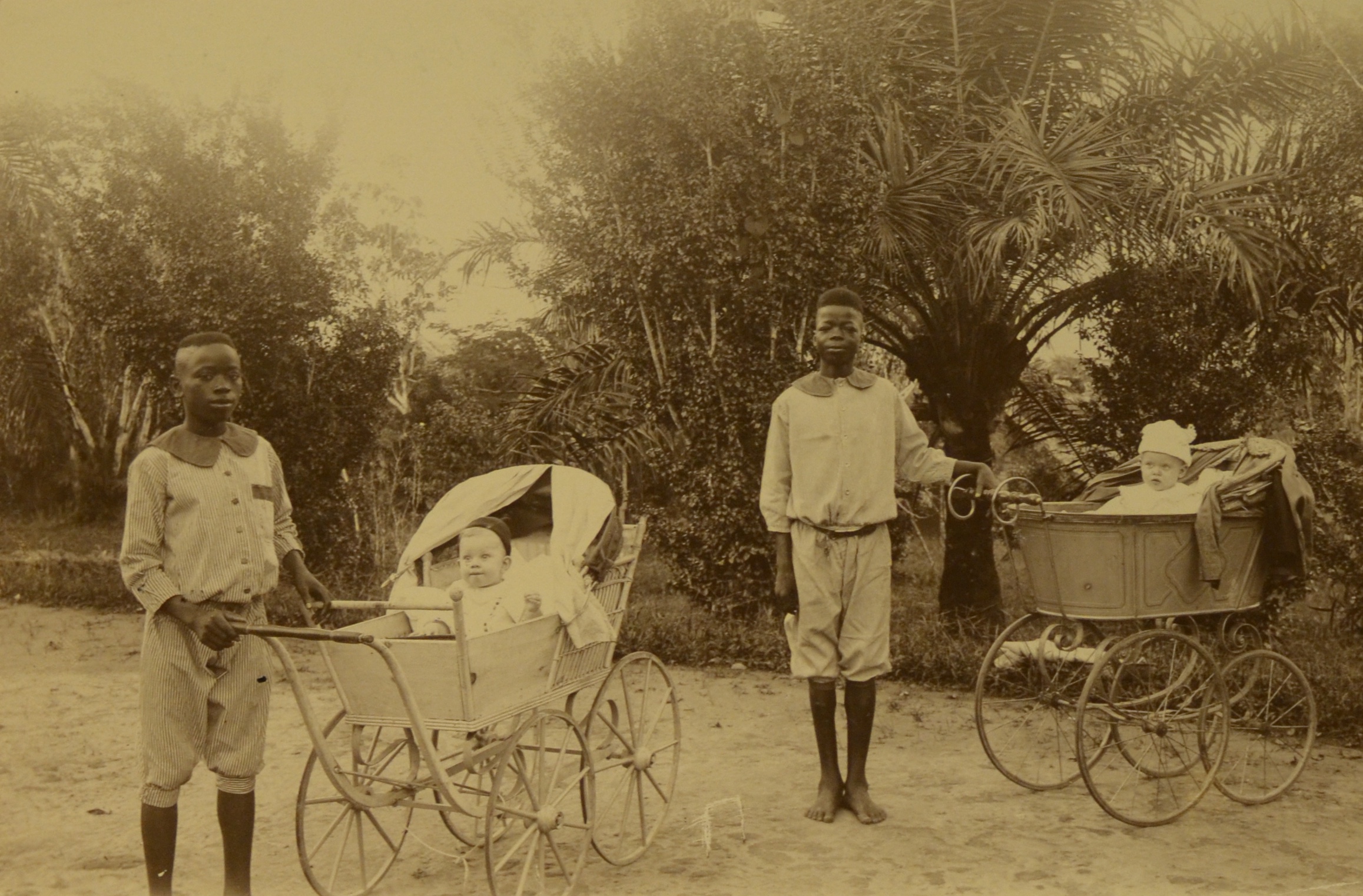 Han visar ett av fotografierna. På bilden håller två kongolesiska unga pojkar i varsin barnvagn med två små svenska missionärsbarn. Kontrasten är stor mellan de barfota pojkarna som allvarligt blickar rakt in i kameran, och de välklädda barnen i vagnarna.