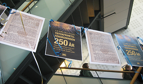 Att Tryckfrihetsförordningen fyller 250 år i år bör uppmärksammas tycker vi på JMG och under 2015 och 2016 har vi deltagit i flera forum, bland annat under paraplyet Global Free Speech. På själva årsdagen firade vi ”på hemmaplan” med personal och studenter.