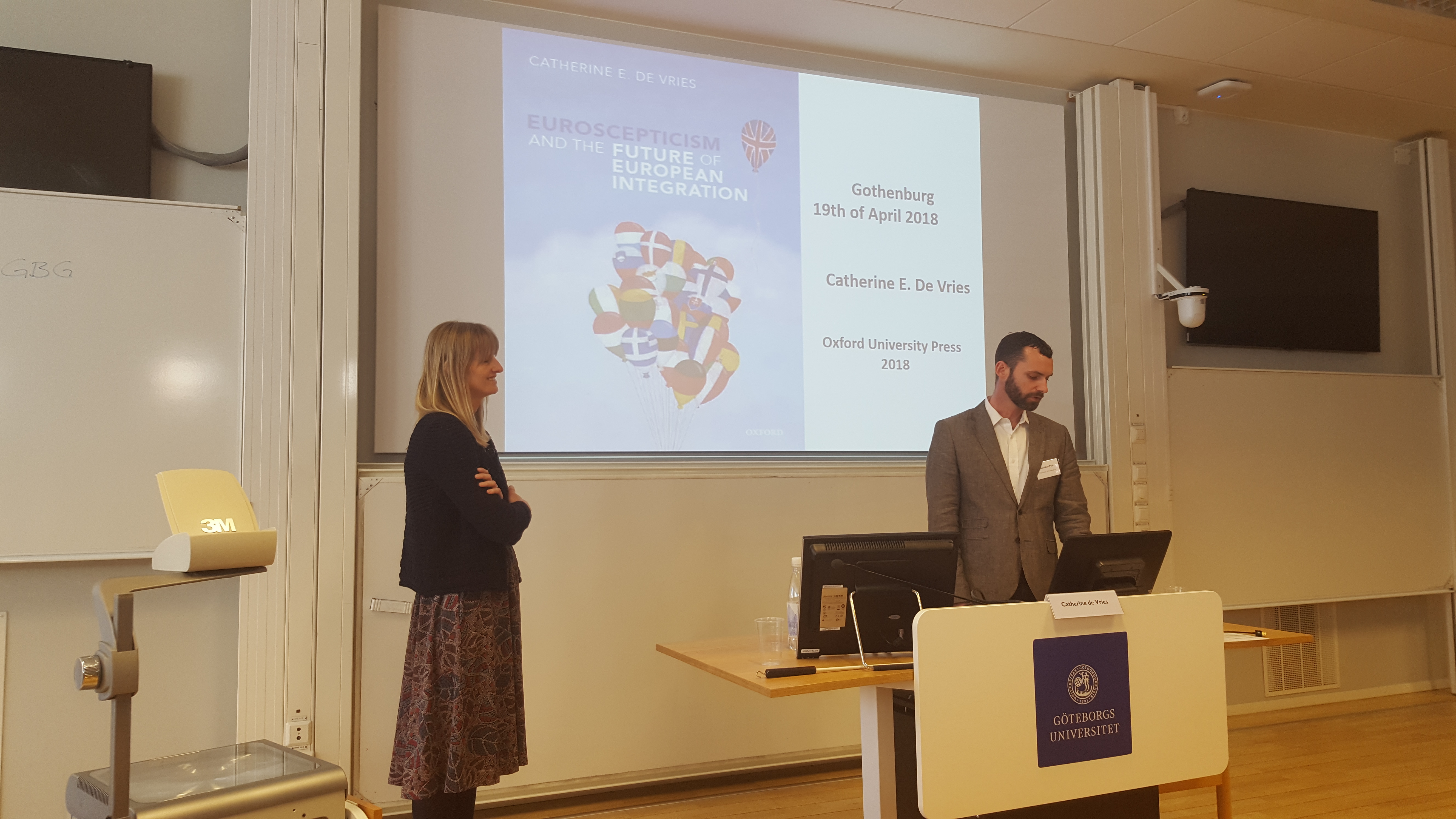 CERGU hade nöjet att samarrangera två mycket intressanta keynoteföreläsningar i samband med att det svenska nätverket för Europaforskning i Statsvetenskap (SNES) vårkonferens gick av stapeln i Göteborg den 19-20 april. Årets konferenstema var ”The European Union: Inside/Out”. Till konferensen hade två internationellt erkända forskare bjudits in som keynotetalare. Dessa var professor Catherine de Vries, University of Essex, som talade om “Euroscepticism and the Future of European Integration”, samt professor Frank Schimmelfennig, ETH Zurich, med titeln “EU enlargement: still the most successful foreign policy of the EU?”. Det var två riktigt bra och välbesökta föreläsningar som följdes av livaktig diskussion med publiken. Medan Catherine höjde ett varnande finger för potentiellt växande euroskepticism, inte minst i Sverige, ville Frank lyfta fram en mer positiv bild av EU:s östutvidgning jämfört med hur den ofta uppfattas.