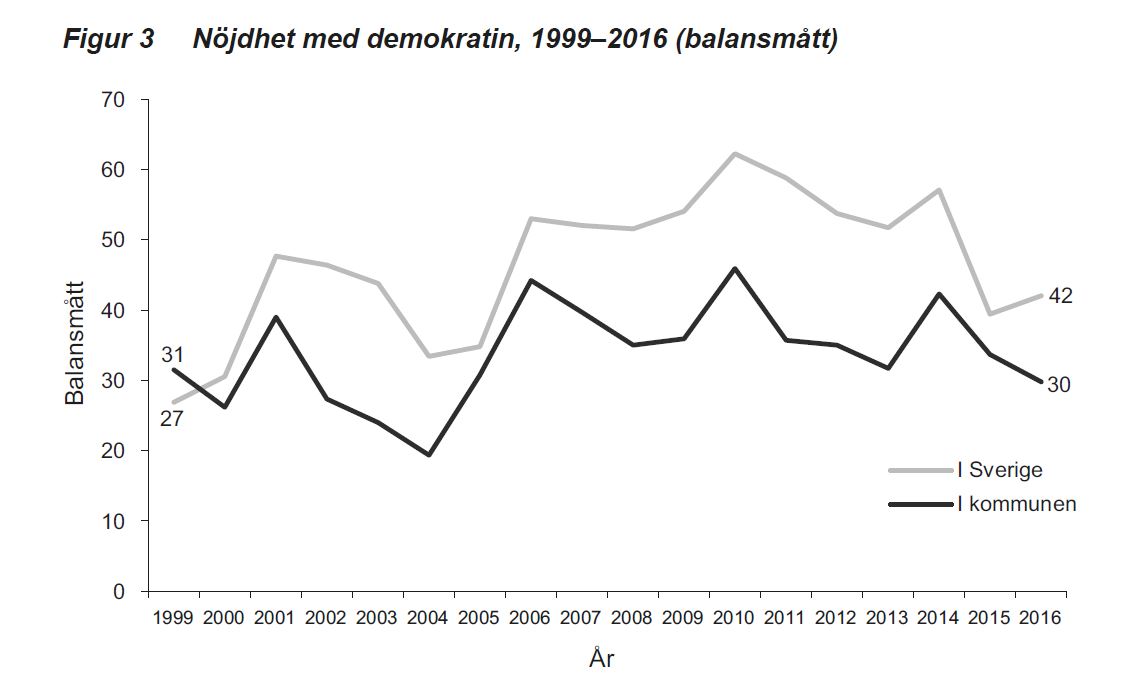 Allra tydligast blir mönstret när svenskarna svarar på hur nöjda de är med demokratin. På denna fråga har de svarande i SOM-undersökningarna varje år sedan millennieskiftet skattat att de är mer nöjda med hur demokratin fungerar i Sverige i stort än i den egna kommunen. Till detta hör också att svenskarna upplever att mer korruption förekommer på kommunnivå än på riksnivå.