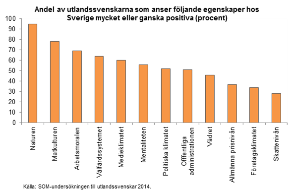 Resultaten är hämtade från SOM-institutets stora undersökning av utlandssvenskar som presenteras i boken Svenska utlandsröster. De svarande i undersökningen har bland annat fått värdera tolv egenskaper hos Sverige på en femgradig skala från mycket positivt till mycket negativt. Huvudmönstret i utlandssvenskarnas bedömningar är att de har en mycket positiv bild av Sverige. För elva av de tolv egenskaperna är det en större andel som är positiva än som är negativa.