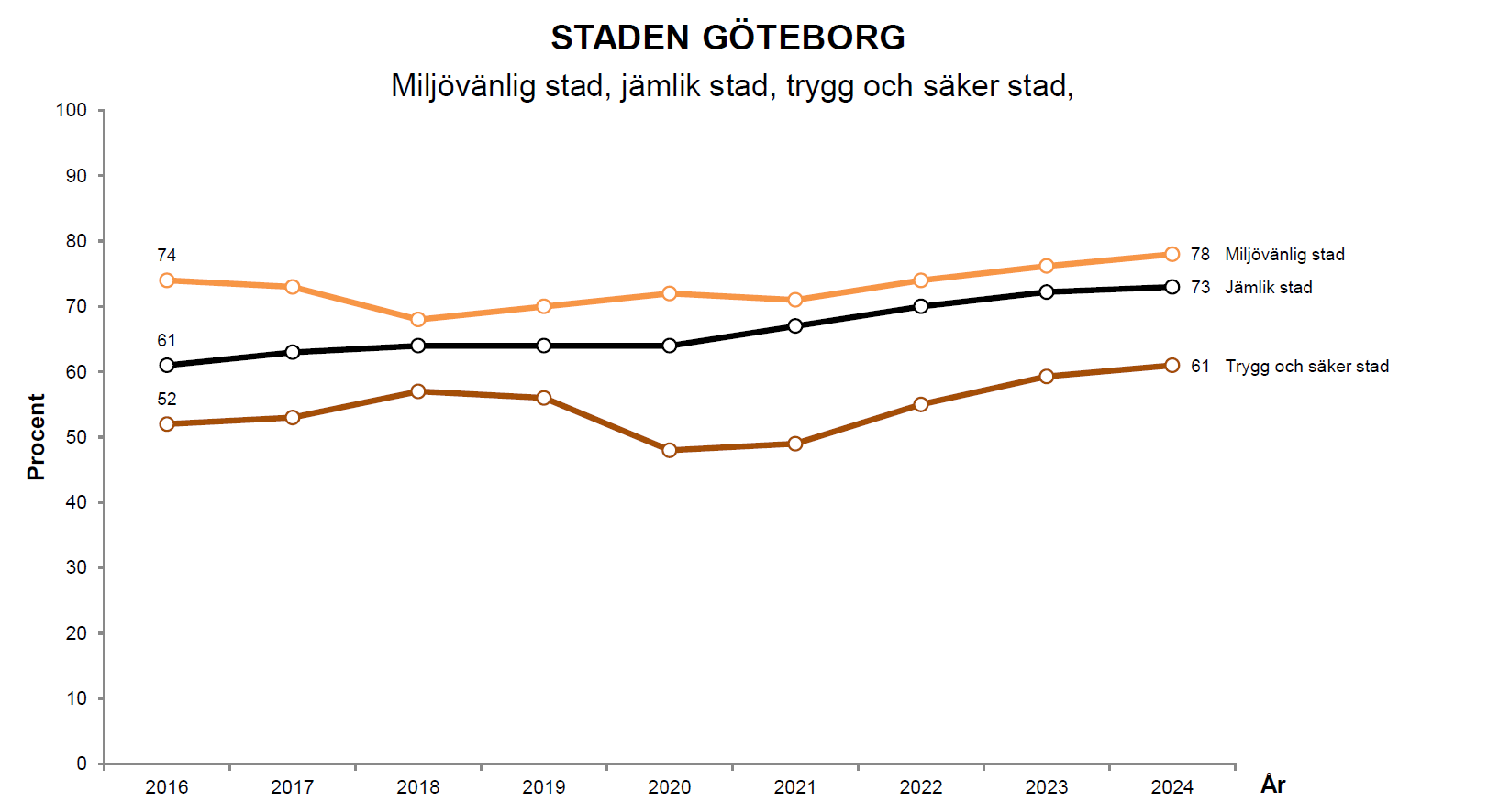 Det är nu 61 procent som helt eller delvis ser Göteborg som en trygg och säker stad, den högsta noteringen sedan mätningen inleddes 2016 och en ökning med 13 procentenheter sedan lägstanoteringen 2020. Dessutom syns långsamma ökningar både i andelarna som upplever staden som jämlik och miljövänlig.