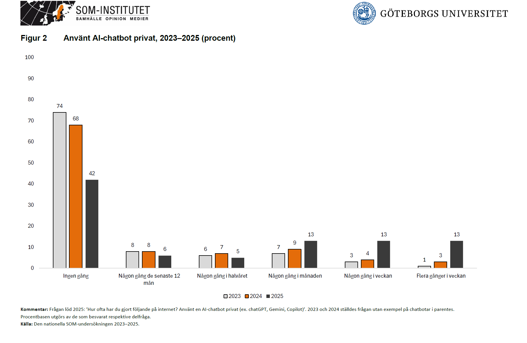 –En viss del av den kraftiga förändringen mellan 2024 och 2025 kan sannolikt härledas till att exempel som ChatGPT och Copilot har lagts till i frågeformuleringen, men vi kan nu alltså med säkerhet säga att AI i form av chatbottjänster tydligt når en majoritet av befolkningen, säger Marcus Weissenbilder, undersökningsledare vid SOM-institutet och ansvarig för AI-frågorna.
