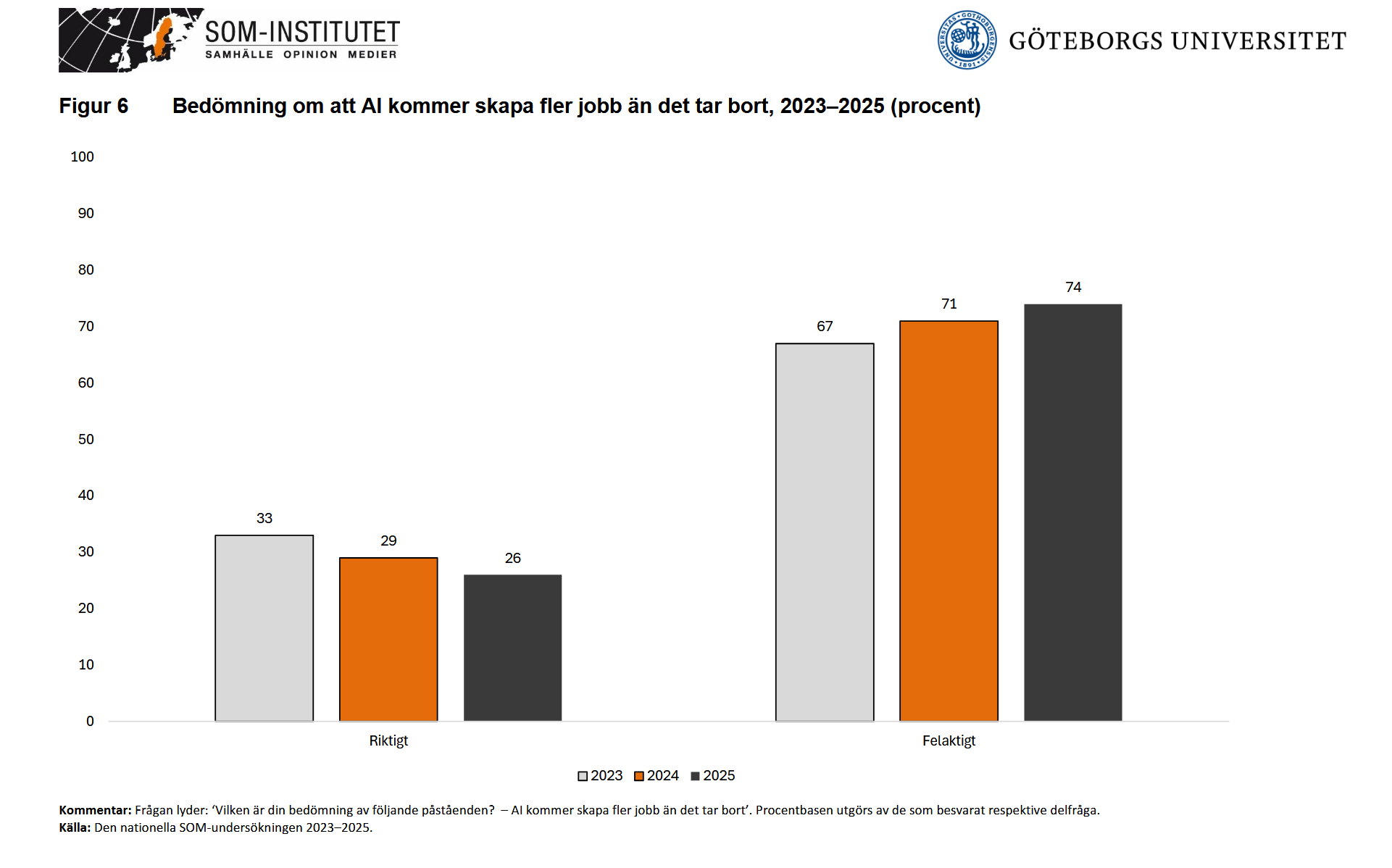 Under tre mätår har såväl inställning till som användning av AI studerats i de årligen återkommande SOM-undersökningarna. Mätningarna redovisas i rapporten Svensk AI-opinion 2023-2025 som släpps idag. Rapporten innehåller alla mätresultat uppdelat på ett stort antal demografiska- och ideologiska grupper. Huvuddragen sammanfattas i texten nedan.