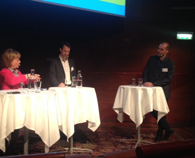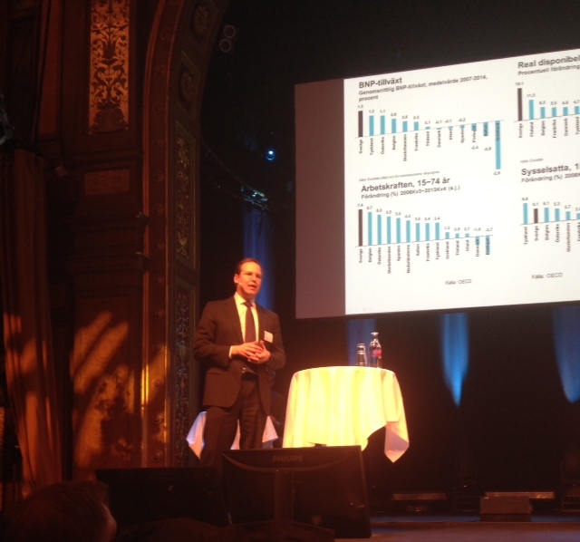 Efter en lunchpaus på Berns terrass var det dags för en programpunkt där ett samtal kring handeln, tillväxten och jobben fördes mellan fyra panelmedlemmar. Här fick även vi i publiken, som satt samlade runt ett 30-tal runda bord framför scenen, chansen att tycka till genom att både ställa och besvara frågor via de datorer som fanns uppställda vid varje bord. Därefter vidtog dagens kanske mest emotsedda punkt: finansminister Anders Borgs uppträdande där han pratade om hur Sverige påverkas av omvärldens svaga ekonomi samt hur jobben i Sverige ska bli fler. Även här fick publiken chansen att ställa frågor och mot slutet av sitt anförande valde Anders Borg att själv ställa en fråga till publiken: - Vad kan ni som handlare göra för att hjälpa ungdomar in på arbetsmarknaden?