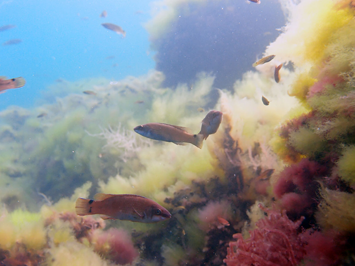 Bild 2: Ålgräsäng i Gullmarsfjorden på Västkusten överväxt av trådformade grönalger och omgiven av smörbultsfiskar. Små fiskarter som smörbult har ökat i antal längs Västkusten, troligen till följd av överfiske. Foto, Per-Olav Moksnes.