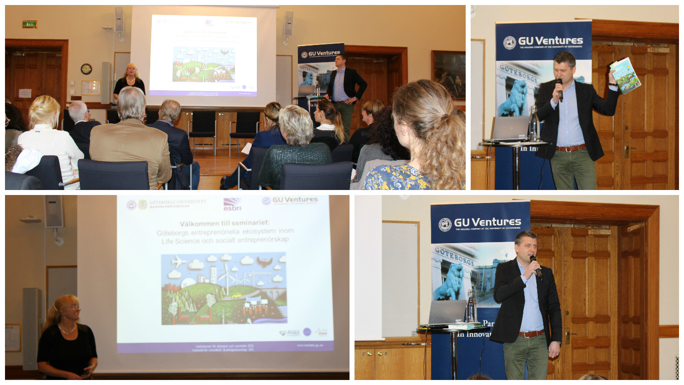 Arrangörerna Maureen McKelvey (Handelshögskolan) och Andreas Albertsson (GU Ventures) började med att hälsa alla välkomna. Efter det presenterade Maureen McKelvey och Olof Zaring, båda verksamma på Institutet för innovation och entreprenörskap, Handelshögskolan vid Göteborgs universitet, sin nya bok Sveriges entreprenöriella ekosystem. Bokprojektet finansieras av Vinnova, Esbri och Sten A Olssons stiftelse för Forskning och Kultur.