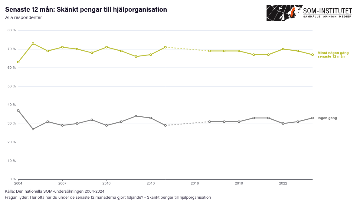 Däremot har SOM-institutet vid Göteborgs universitet koll på hur stor andel av befolkningen som skänker pengar till en hjälporganisation någon gång under året. Deras senaste mätning visar att två tredjedelar av befolkningen, 67 procent, skänker pengar någon gång per år eller oftare.