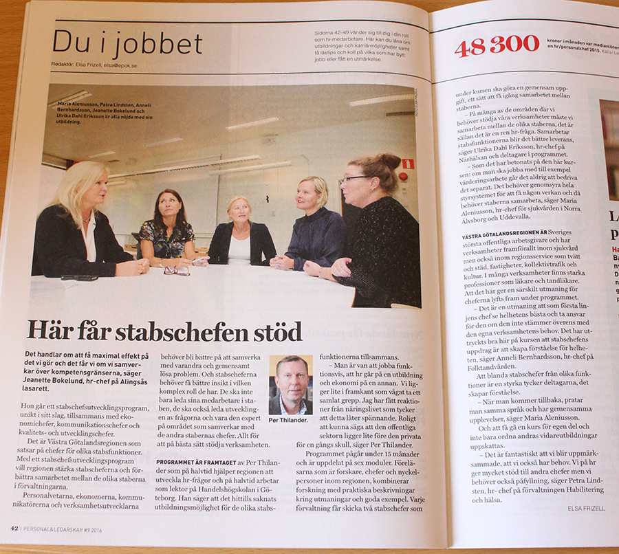 I ett unikt utvecklingsprogram satsar Västra Götalandsregionen på att stabschefer inom ekonomi, kommunikation, kvalitet och utveckling ska öka sin kompetens och samtidigt förbättra samarbetet mellan staberna i förvaltningarna. Programmet är framtaget av Per Thilander som delar sin tid mellan att vara universitetslektor på Handelshögskolan samt föreståndare för Centrum Global HRM och att stötta regionen med att utveckla HR-frågor.