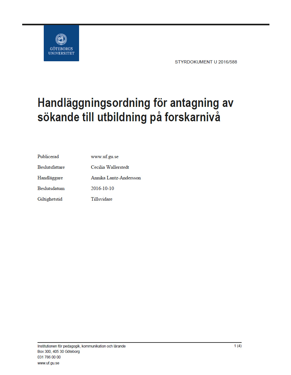 Du som är intresserad av att påbörja utbildning på forskarnivå rekommenderas att ta del av den allmänna studieplanen för barn- och ungdomsvetenskap respektive pedagogik och att kontakta studierektor vid institutionen för mer detaljerad information. Till utbildning på forskarnivå antas endast doktorander som kan erbjudas handledning och godtagbara studievillkor samt har studiefinansiering.