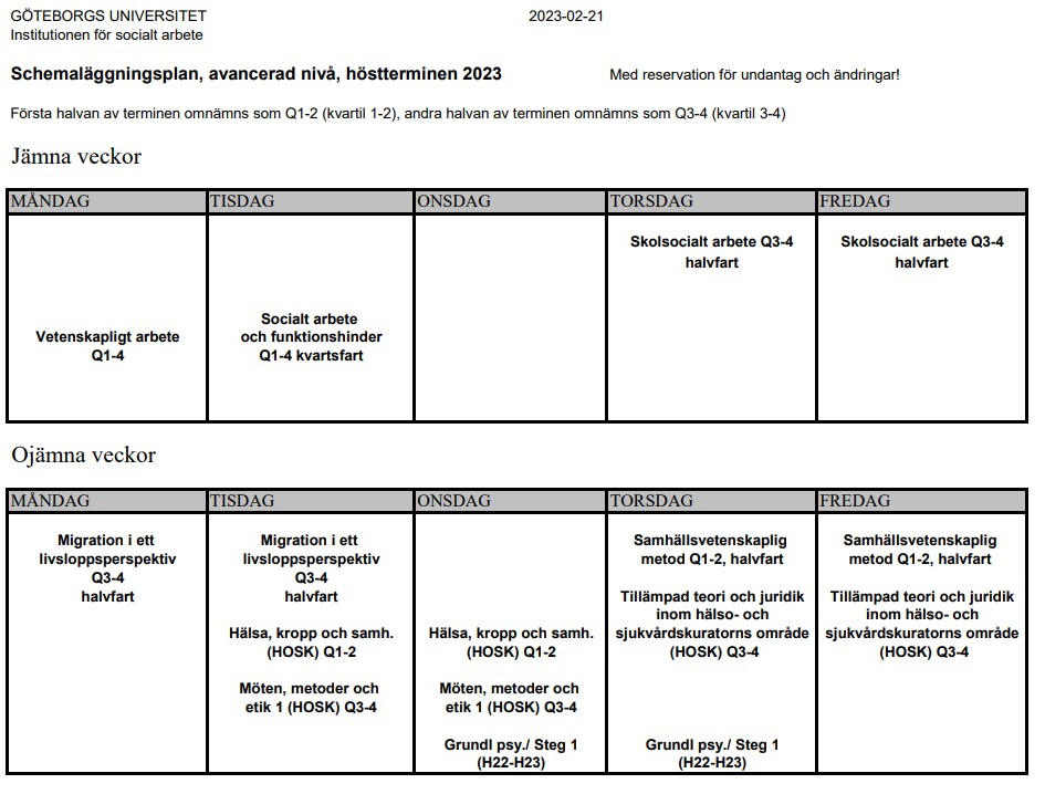 Ta steget vidare med våra avancerade studier inom socialt arbete. Välj mellan internationella och nationella mastersprogram, den treåriga påbyggnadsutbildning i psykoterapi och ett brett utbud av fristående kurser. Med fristående kurser kan du själv skräddarsy din egen magister- eller masterexamen som passar dina intressen.