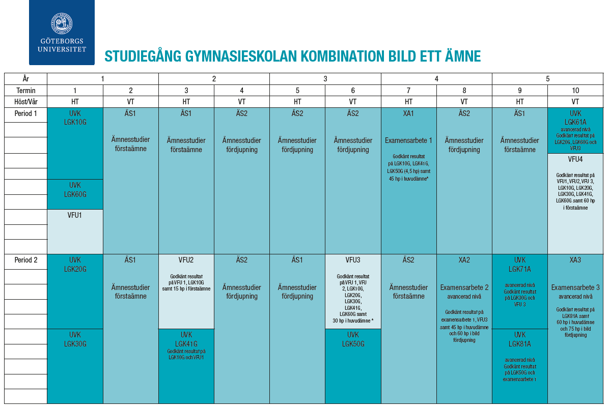 Göteborgs universitet erbjuder följande ämnen: bild, biologi, engelska, filosofi, franska, fysik, geografi, hem- och konsumentkunskap, historia, idrott och hälsa, kemi, latin, matematik, musik, religionskunskap, samhällskunskap, slöjd, spanska, svenska, svenska som andraspråk, teater, teknik, tyska. Vilka ämnen som går att kombinera med varandra framgår av Ämneslärarprogrammets broschyr nedan.