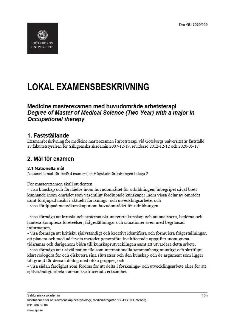Vi ger utbildning i arbetsterapi på avancerad nivå i form av fristående kurser. Detta innebär att du har möjlighet att forma din magister/masterexamen i arbetsterapi utifrån intresse och kunskapsbehov. Du kan gå kurser vid Göteborgs universitet såväl som vid andra universitet och få dessa godkända när du ansöker om att få ta ut en magister/masterexamen i arbetsterapi vid Göteborgs universitet. Vissa kurser är obligatoriska medan andra är fria att välja utifrån eget intresse och kunskapsbehov. Flertalet av kurserna ges digitalt.