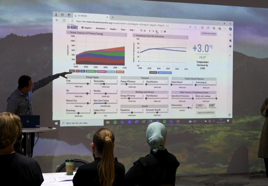 Titta på vår video där studenter försöker begränsa temperaturökningen till 1,5 grader i En-ROADS-simulatorn genom rollspelsförhandlingar, där varje grupp representerar en specifik intressent.